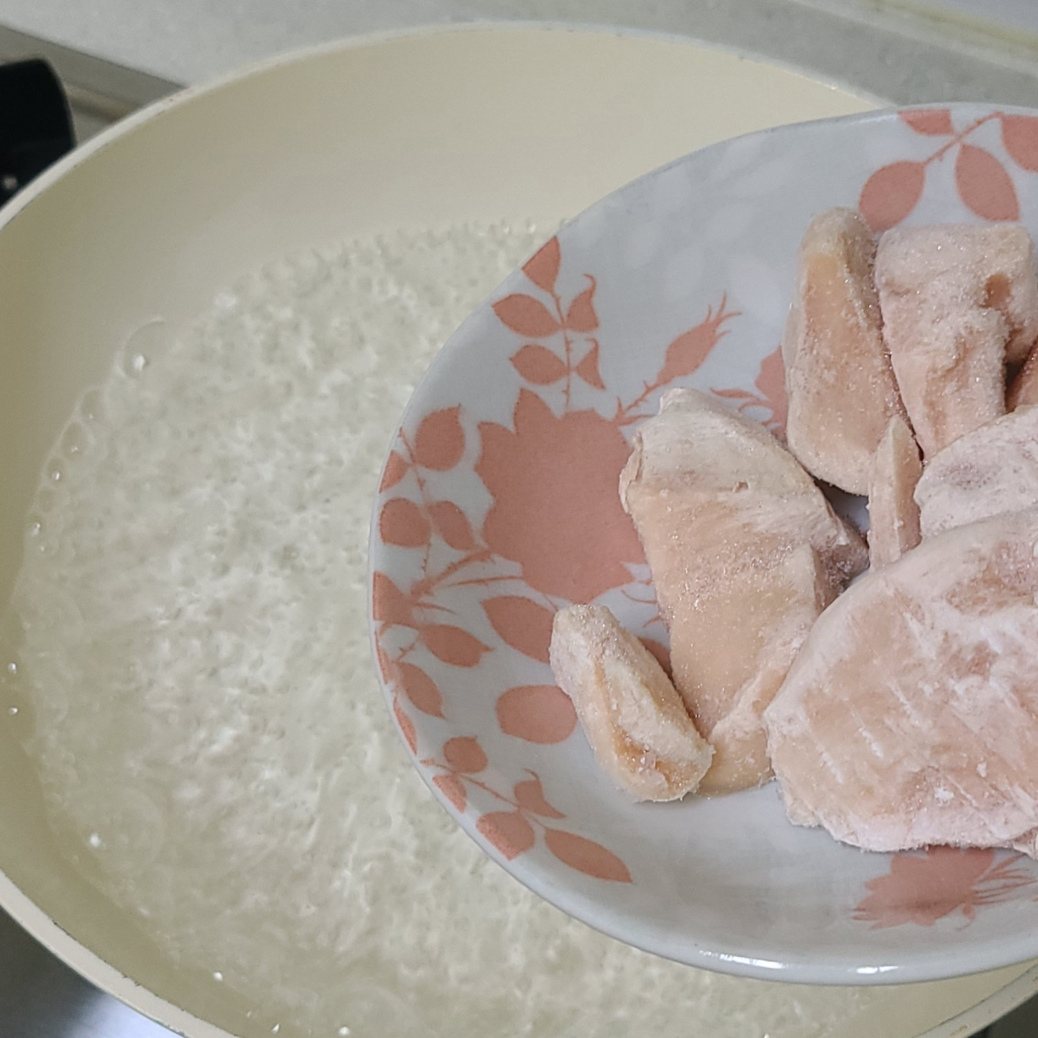 물 800 ml , 냉동 닭가슴살 150 g , 소금 한 꼬집