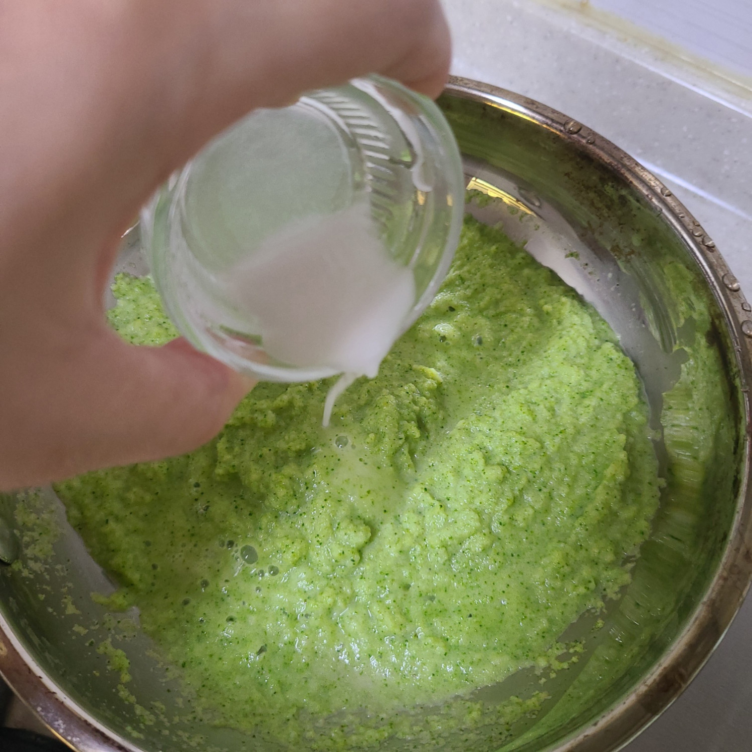 브로콜리 퓨레는 감자전분과 물 섞은 것을 약불~중약불 사이에 잘 섞어주며 저으면 농도가 딱 맞는답니다