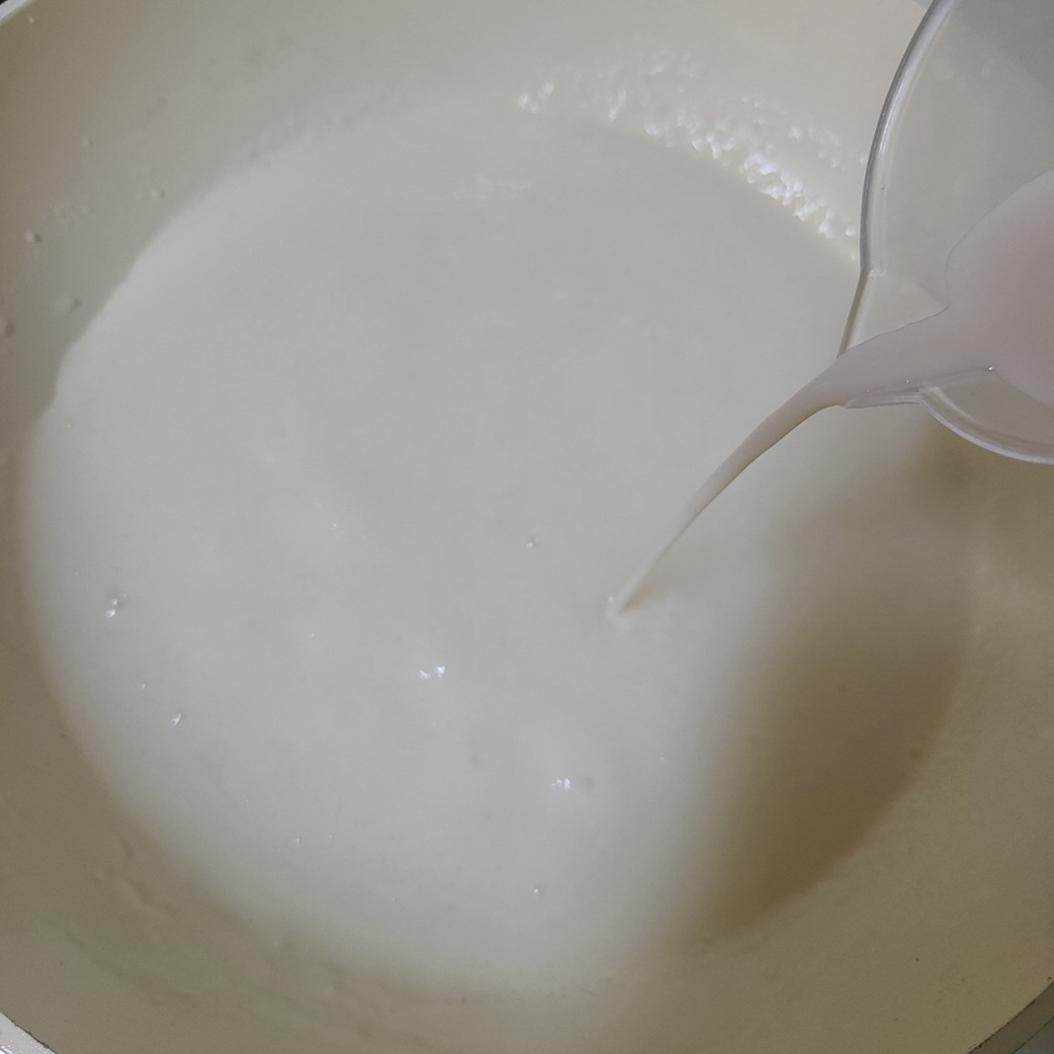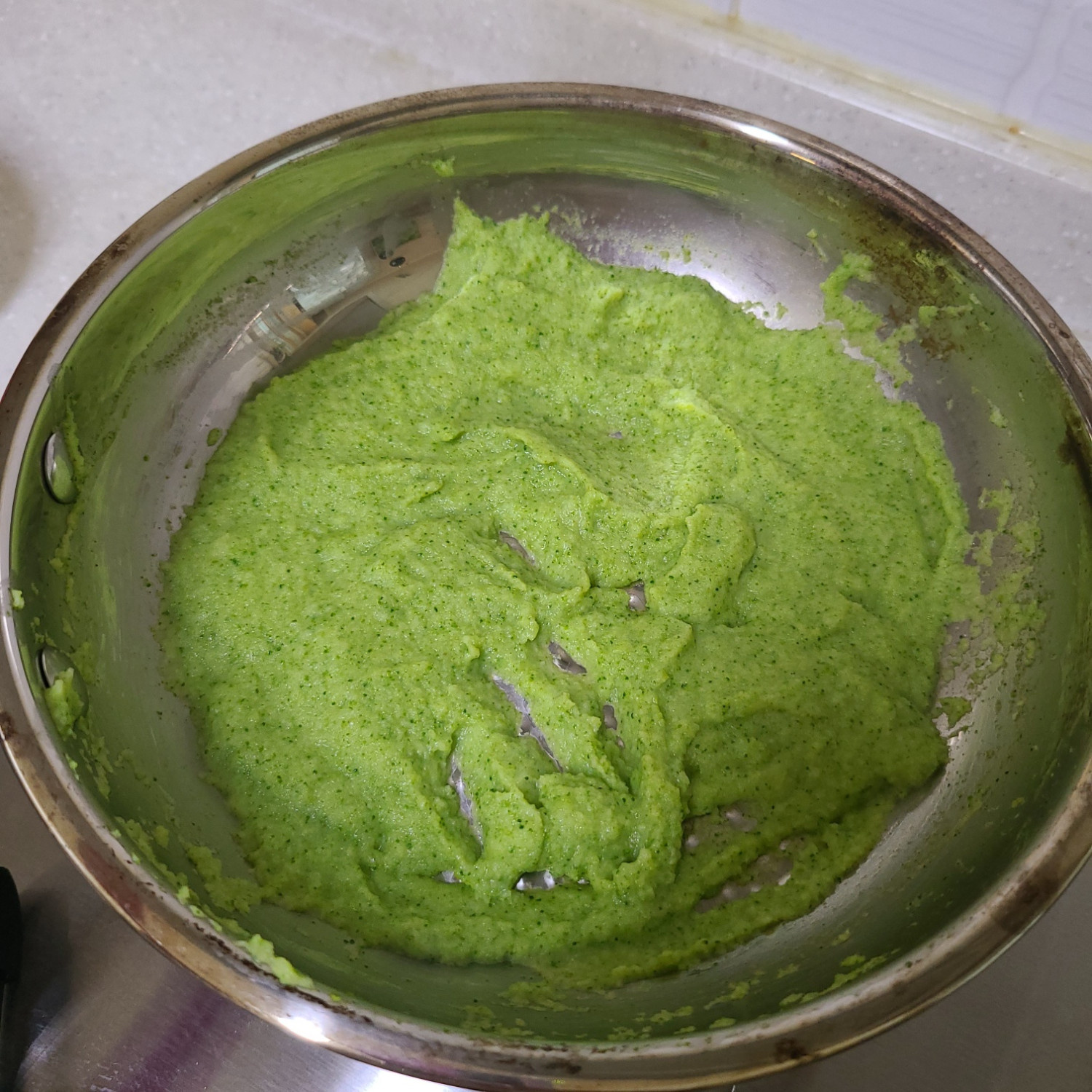 후라이팬에 아까 간 브로콜리 퓨레를 넣고 감자전분 티스푼 1/2+물 티스푼 하나 섞은 것을 끓어오르면 넣어주며 약불~중약불로 2분 30초 저어주세요