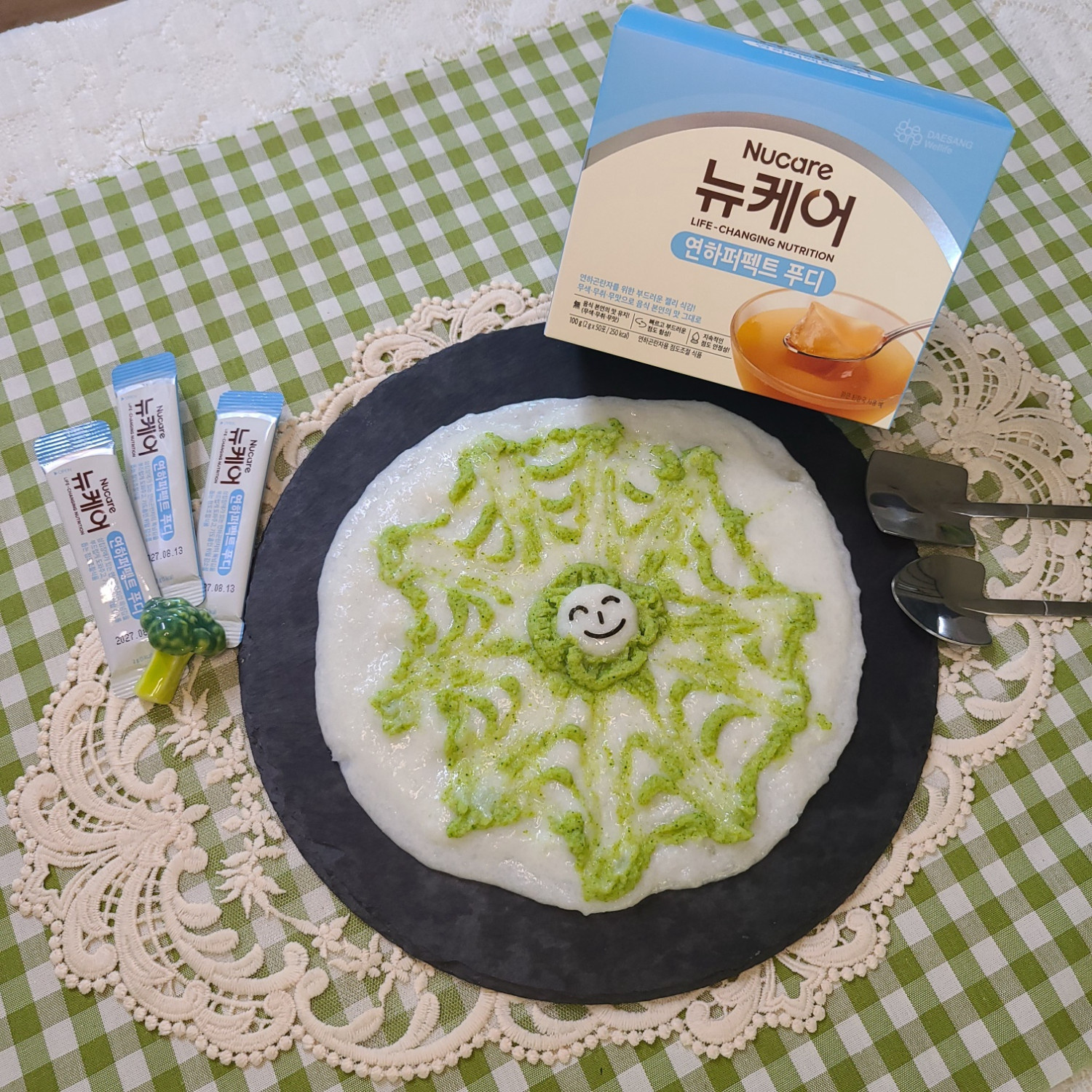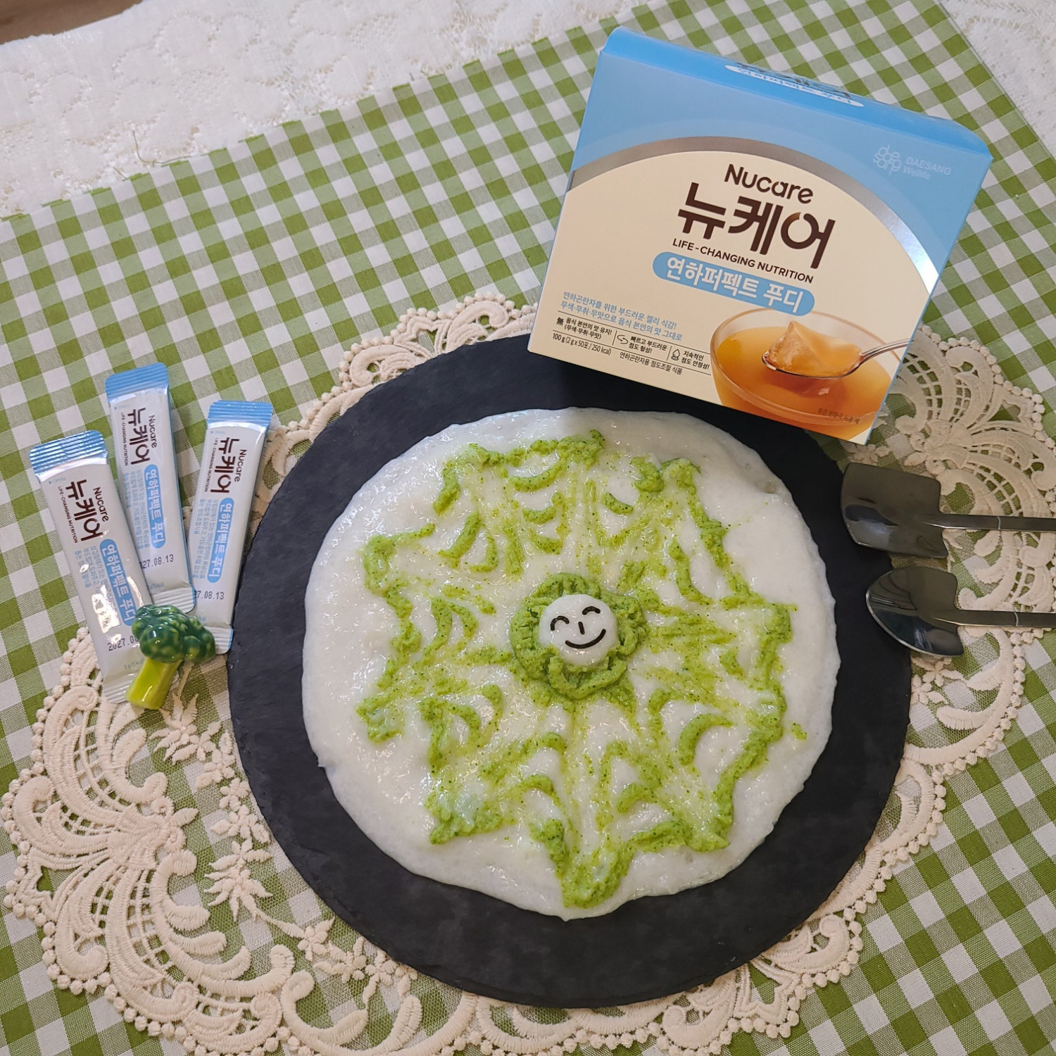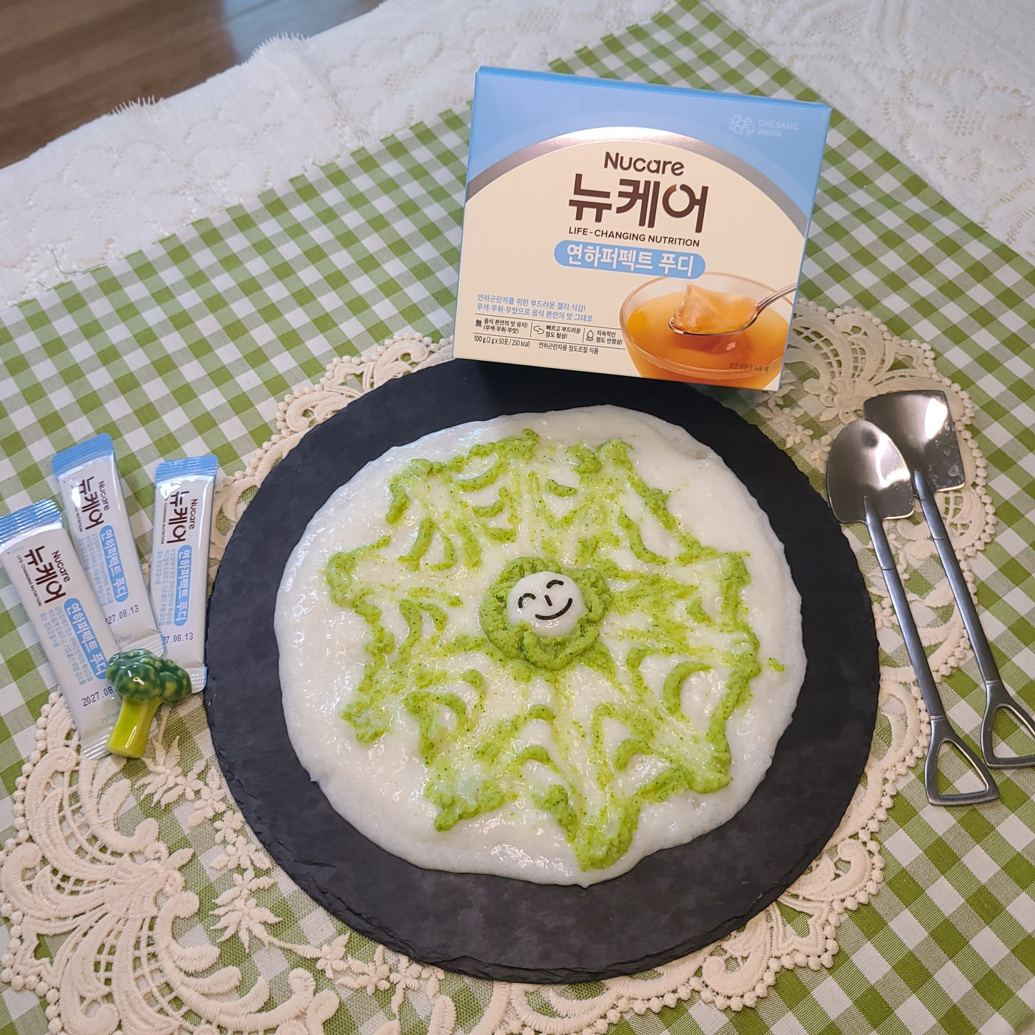무염 닭육수 크림리조또를 먼저 깔고 연하식 브로콜리 퓨레를 얹어주면 완성이랍니다!