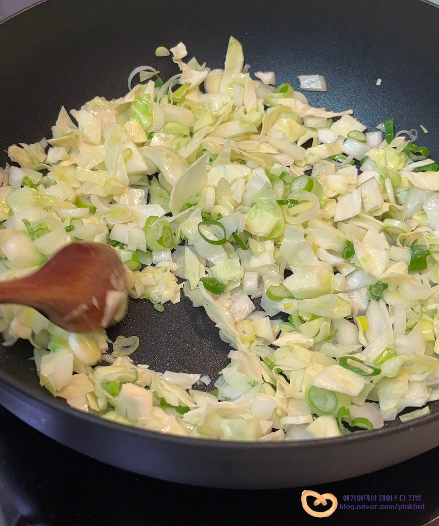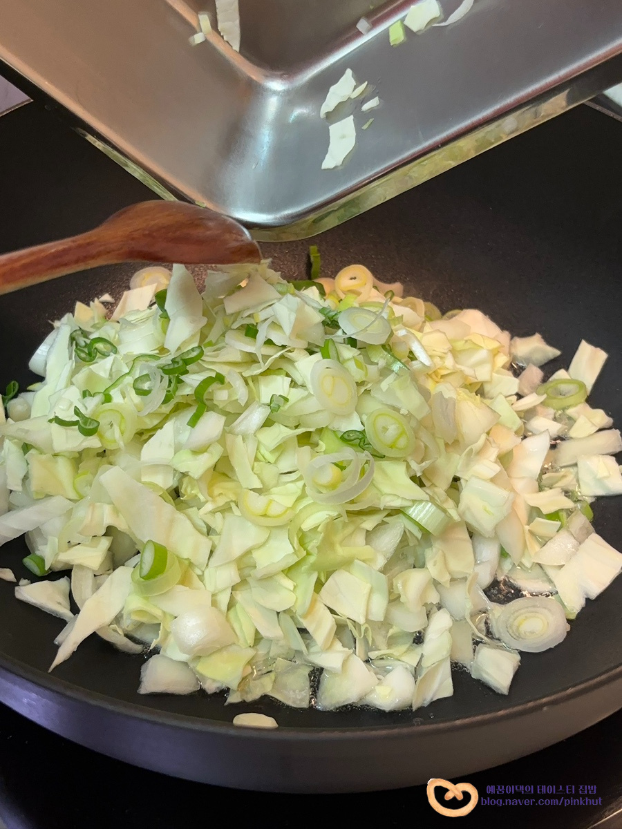 먼저 넉넉한 프라이팬이나 웍에 식용유 3T 두르고, 대파, 양파, 양배추를 넣어주세요