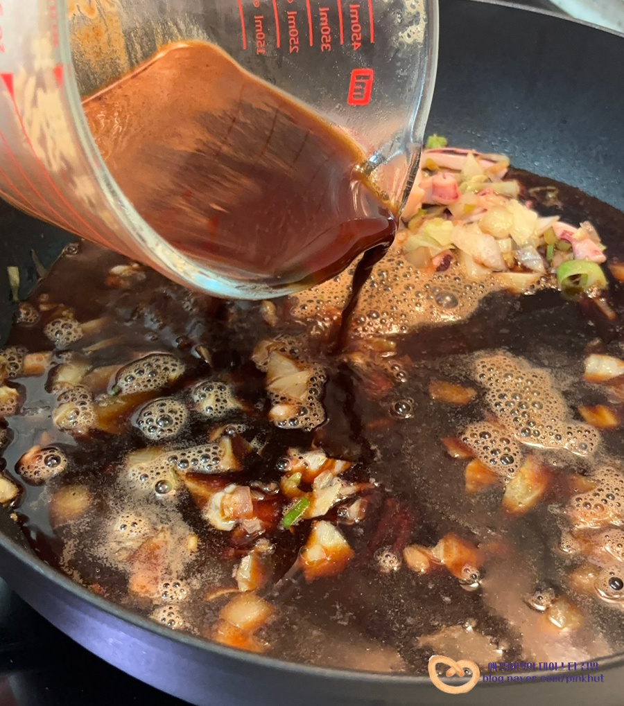 재료준비 단계 중 짜장가루 풀어둔 물 (짜장가루 50g+ 물 900ml)을 부어주세요.