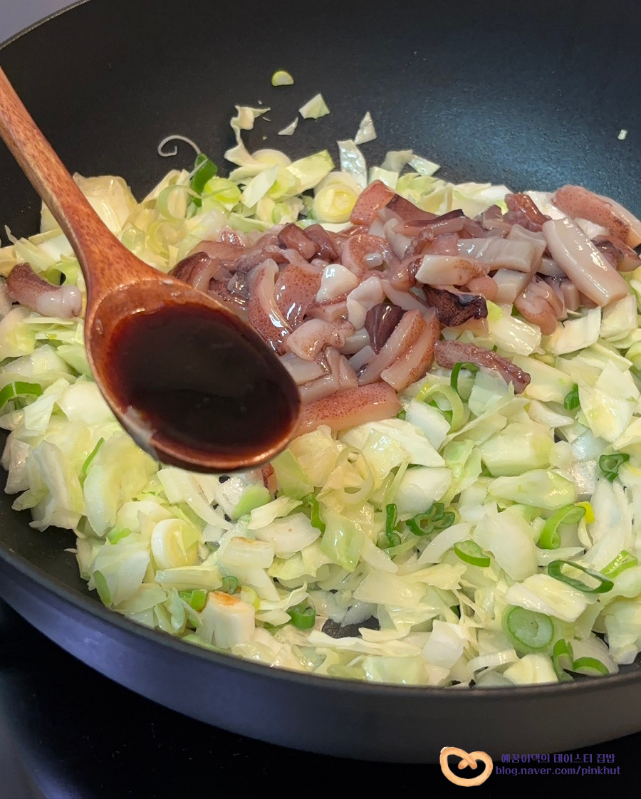 오징어와 불맛을 더해줄 진간장 1T를 넣어 볶아주세요.