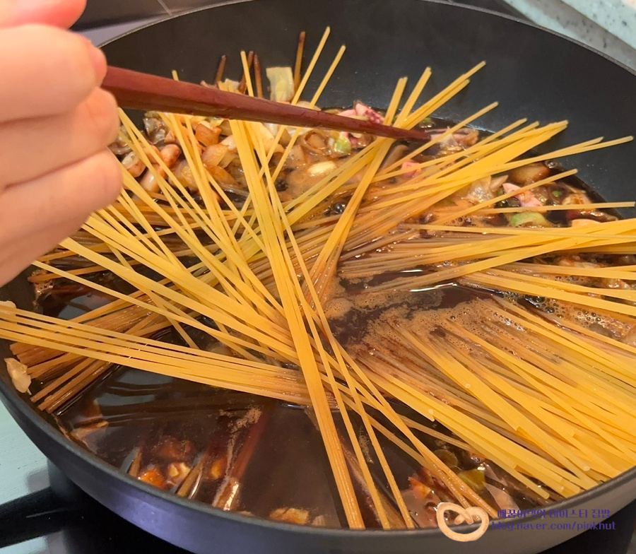 이어서 파스타면을 촤라라 펼쳐 넣어주는데요, 그냥 두면 면이 골고루 익지 않아요.