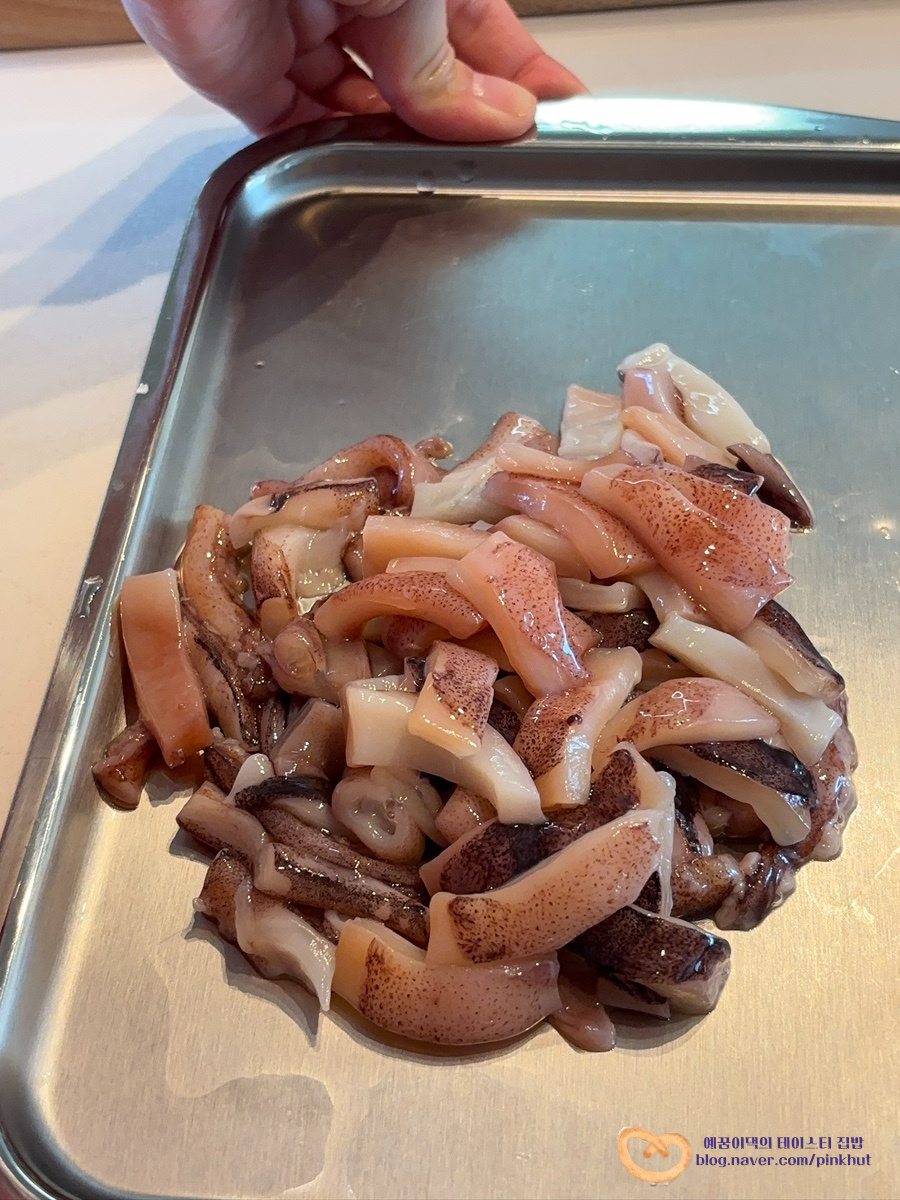 오징어는 몸통 절반으로 가르고 먹기 좋게 잘라주고요, 다리 부분도 큼직하게 잘라줍니다