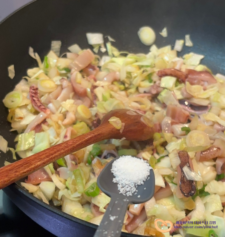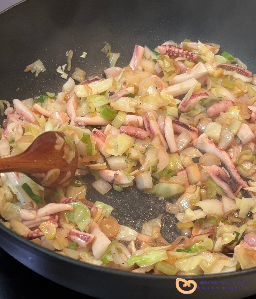 오징어가 다 익지 않아도 괜찮아요. 가볍게 불향만 내어 볶아주시면 됩니다