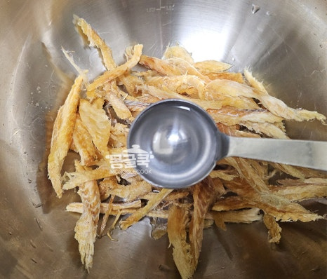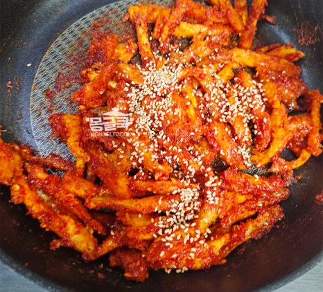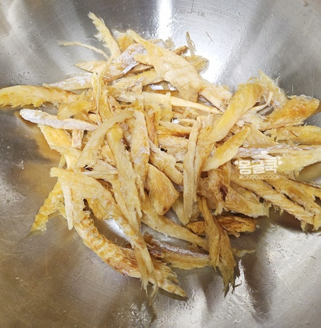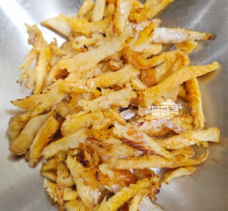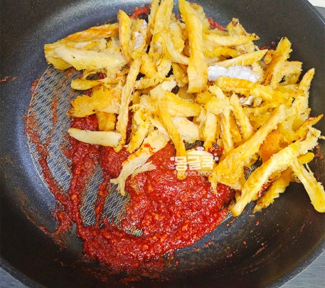 황태채를 다 볶은 후에는 불을 잠시 끄거나 아주 약하게 줄여주세요.