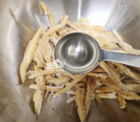 손질한 황태채에 마요네즈 1큰술을 먼저 넣고 골고루 버무려주세요.