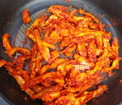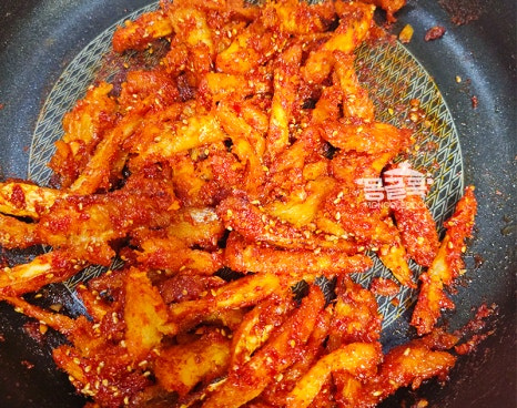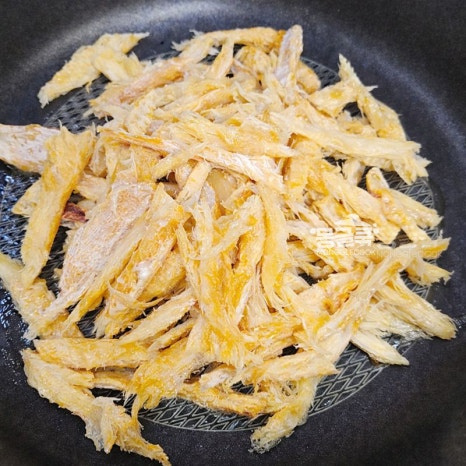 마요네즈에 버무린 황태채를 약불에서 먼저 볶아주세요.