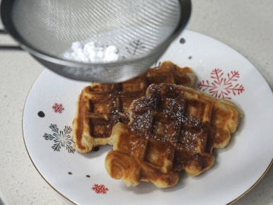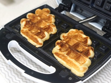 예열된 와플메이커에 생지를 올리고 뚜껑을 덮어 눌러 4~5분 구워주세요.