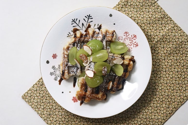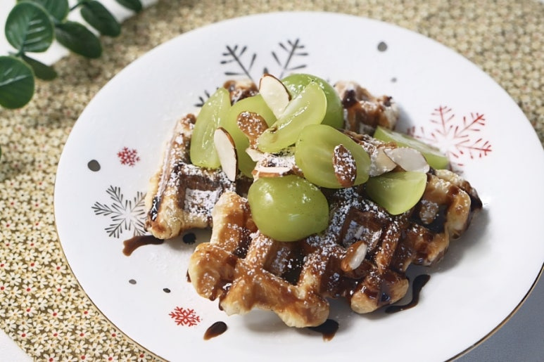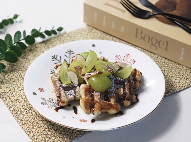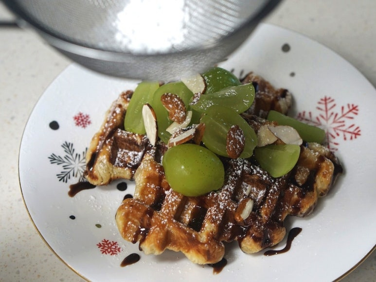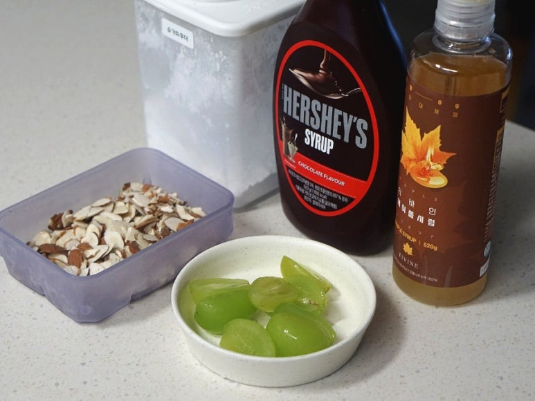 와플이 구워지는 동안 부재료를 준비해 주세요. 저는 슈가파우더, 초코시럽, 아몬드, 샤인머스켓 정도 준비했어요.