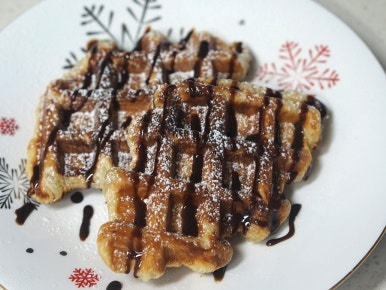 크로플 위로 1차 슈가파우더를 뿌려준 후 초코시럽을 적당량 올려주세요.