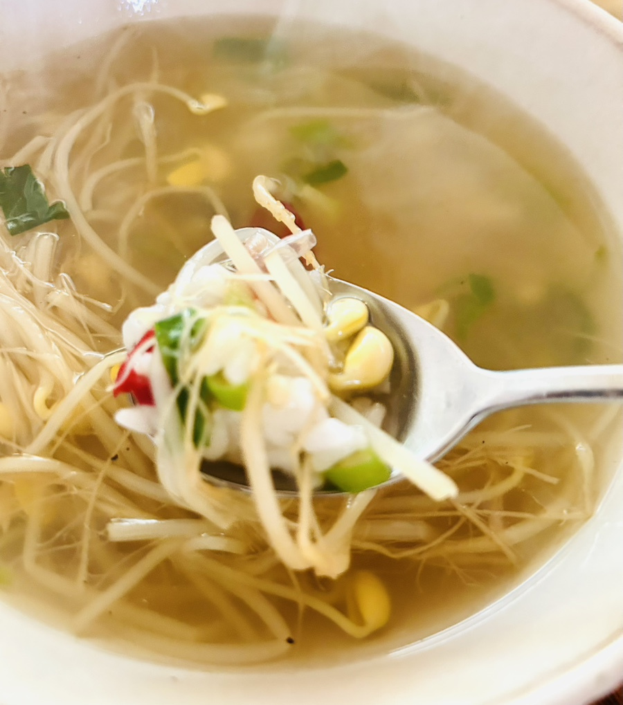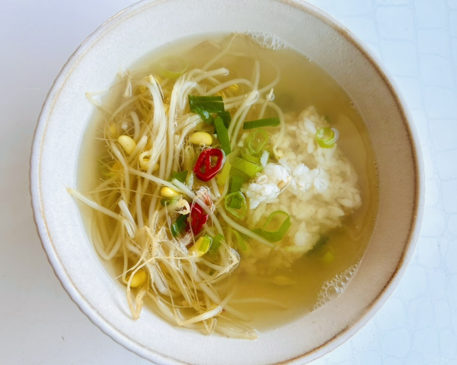 콩나물에 함유된 아스파라긴산은 간의 피로를 풀어주는 효과가 있어서 해장 음식으로도 잘 활용되죠. 따끈하고 시원한 콩나물국에 밥을 반 공기 정도 넣어 주니 콩나물 국밥이 되네요.