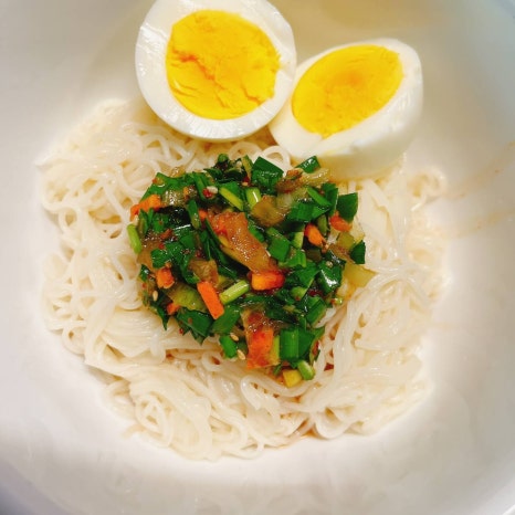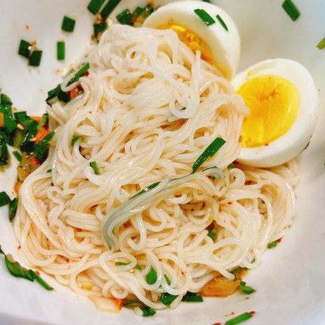 소면 하남 삶아서 다른재료 없이 부추짝비아 만 넣어서