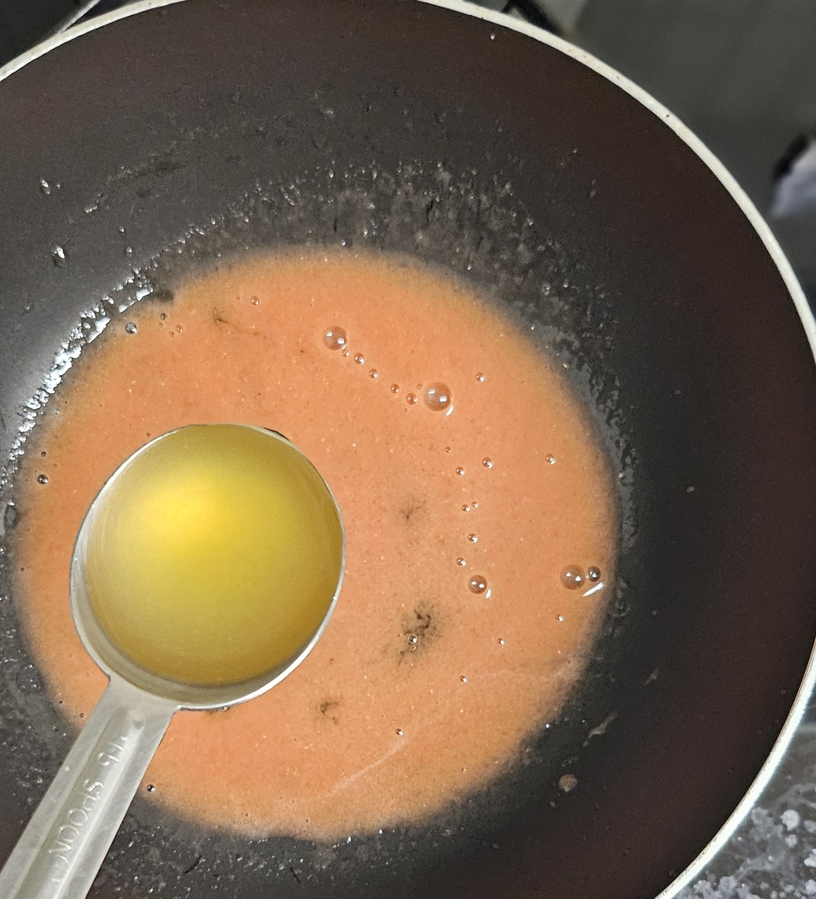 *냄비에 토마토즙을 넣고 저으면서 끓이다가