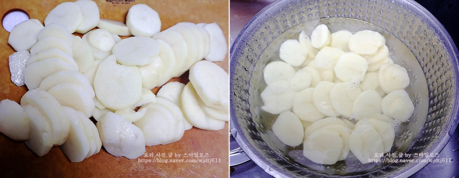 감자는 먹기 좋은 크기로 썰어서 물에 담가 전분기를 빼줍니다