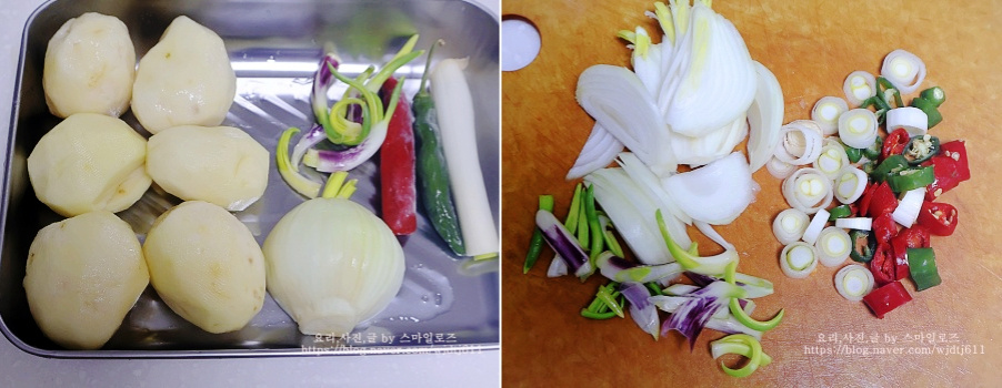 감자 작은 것 6개 양파 1/2개 대파 10cm 청양고추 1개 홍고추 1개 황태 코인 육수 2알