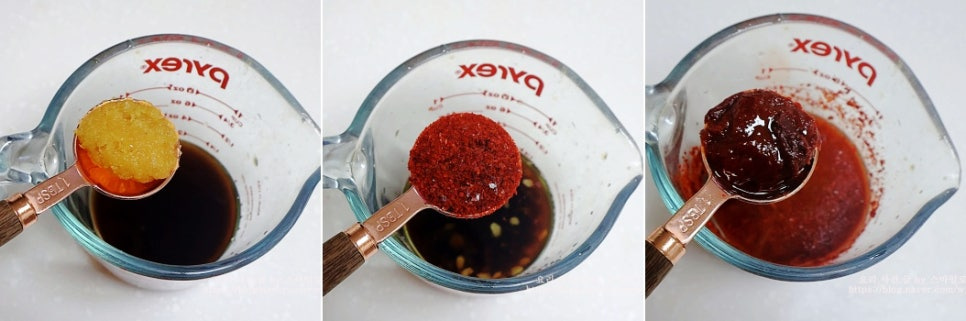 진간장 2큰술 참치 액 1큰술 고추장 1큰술 고춧가루 2큰술 다진 마늘 1큰술 올리고 당 1큰술 식용유 2큰술 물 2컵 후춧가루 , 계량스푼/계량컵 사용 1큰술=15ml 1작은술=5ml 1컵=200ml