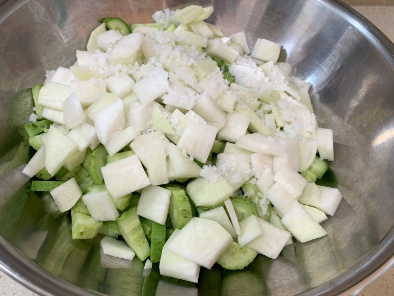 굵은 소금을 넣어 주고 잘 섞어서 절여 줍니다.
