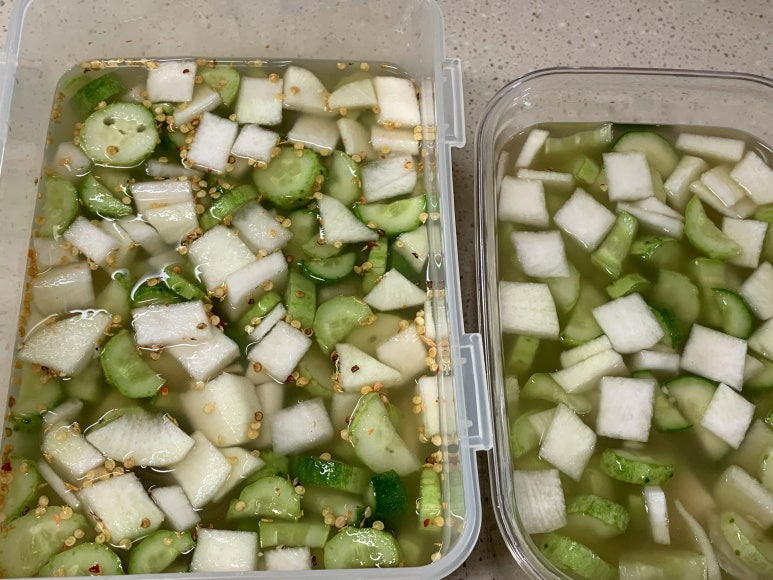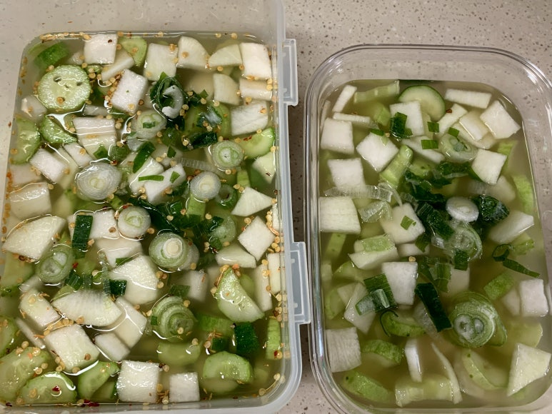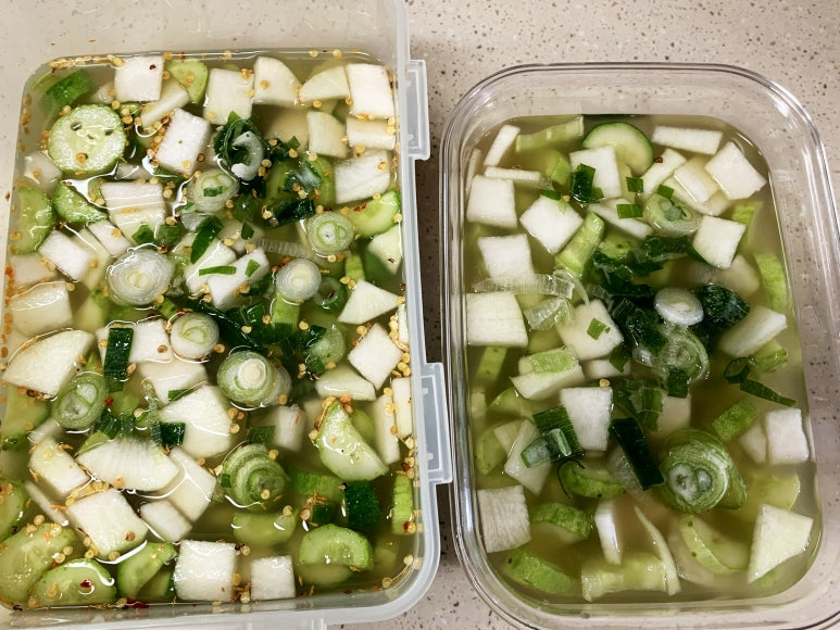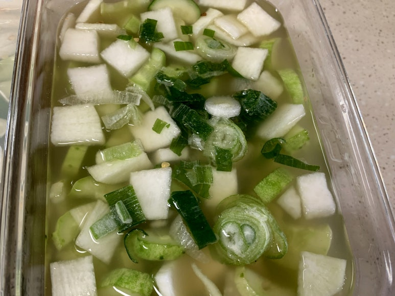 그럼 오이와 무를 이용해서 시원하게 만든 오이물김치 완성입니다.