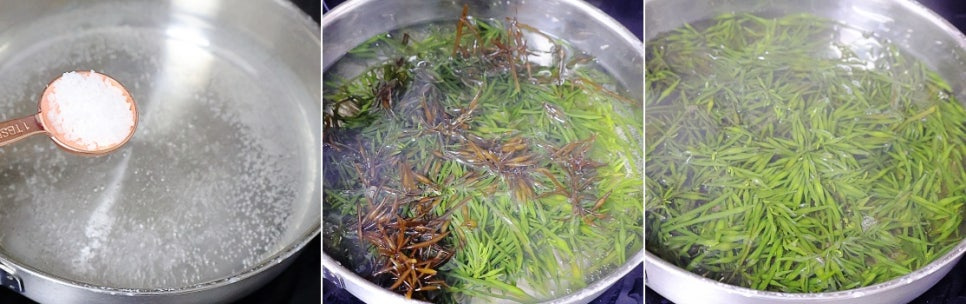 물이 팔팔 끓으면 굵은소금 1큰술을 넣고 톳을 넣어줍니다