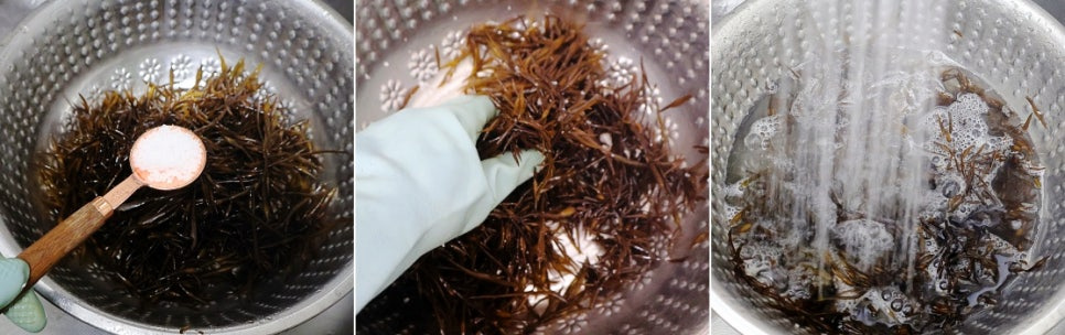 톳을 주물러 세척한 후 물에 2~3번 헹군 후 식초 1큰술을 푼 물에
