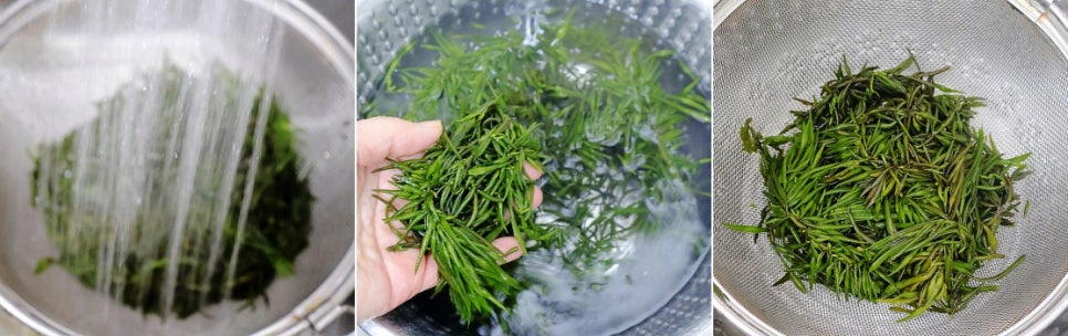 데친톳은 잔열로 더 이상 익지 않도록 재빨리 흐르는 물에 헹구어