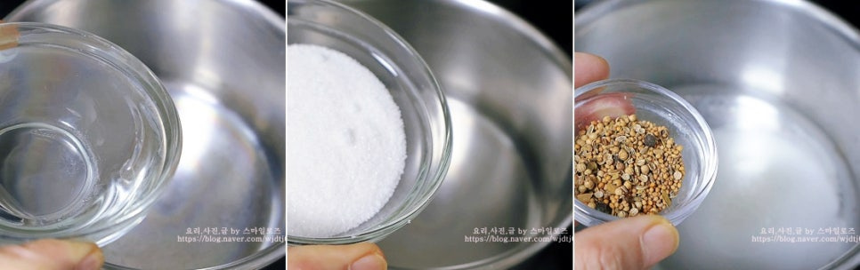 냄비에 물 2컵과 설탕 1컵 피클링스파이스 1큰술을 넣고