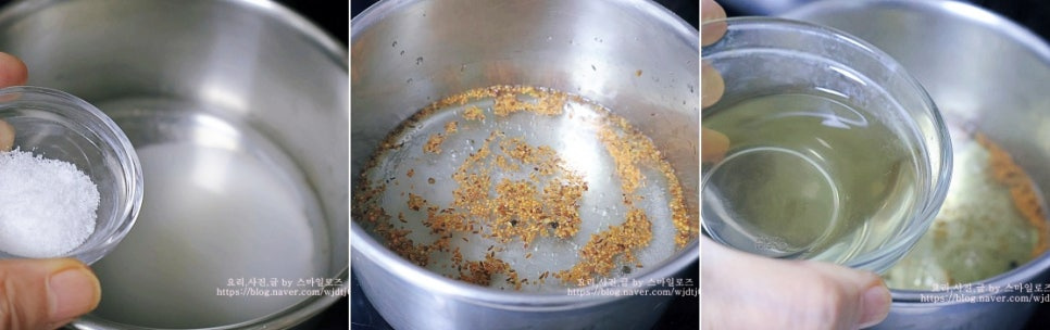 재료 담은 용기에 작은 채를 올리고 뜨거운 소스를 그대로 부어줍니다