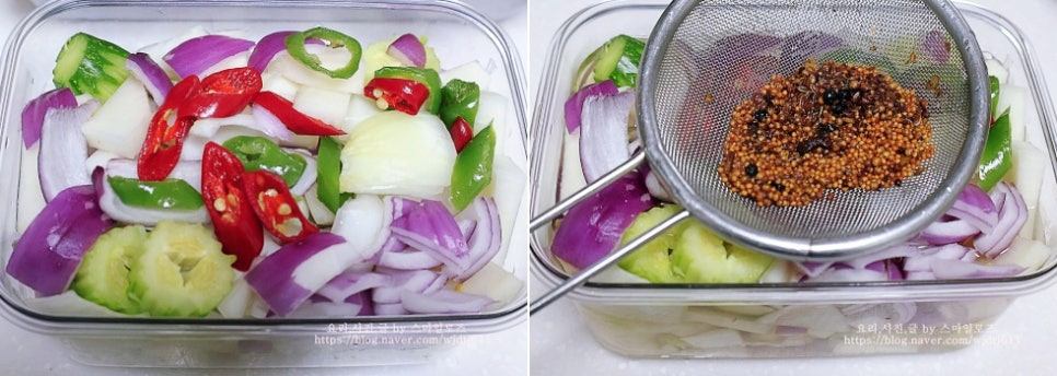 깔끔하게 보관하기 위해 절임물 재료는 채로 받쳐 건져냈어요