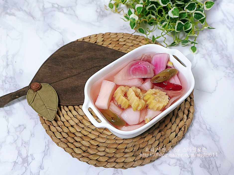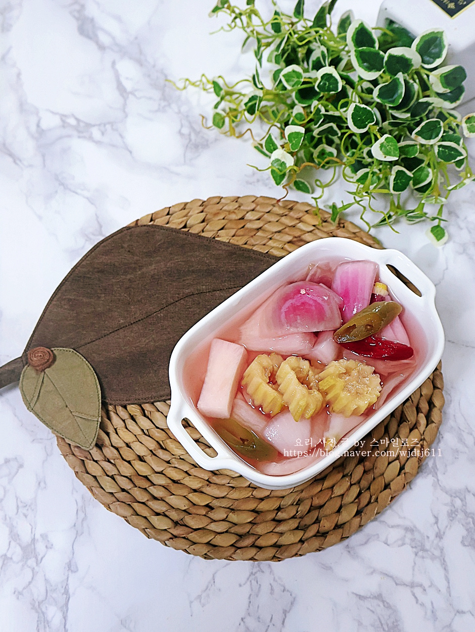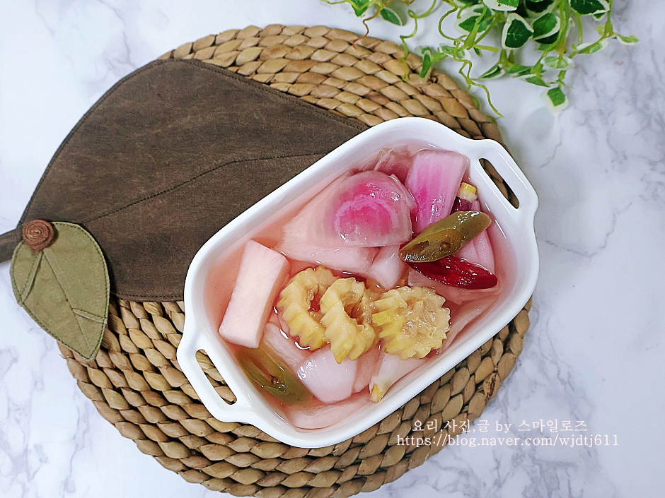 자색양파가 들어가 절임물이 약간의 핑크색이 도는 게