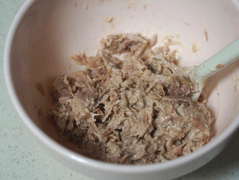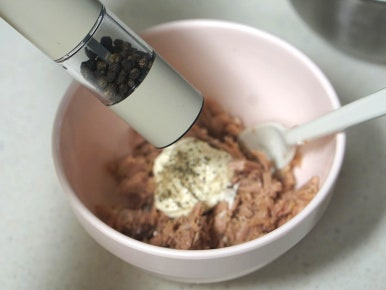 기름 뺀 캔참치에 마요네즈 2T, 후추 갈갈해 고루 섞어주세요.