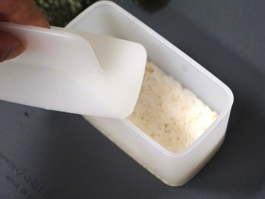 무스비틀에 밥을 깔고, 그 위로 참치마요, 계란지단, 다시 밥 순으로 올려 꾹꾹 눌러 모양을 잡아주세요. 재료들의 색감이 또렷하지 않아 저는 사이 사이 김을 깔아줬는데 김은 생략하고 순서대로 올려 무스비를 만들어도 좋습니다.