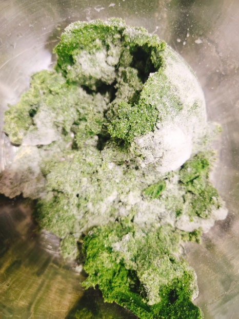 갈아주세요 갈다가 수분이 부족하면 물진짜 소량만 넣고 반죽이 될정도만 갈아주시면 됩니다