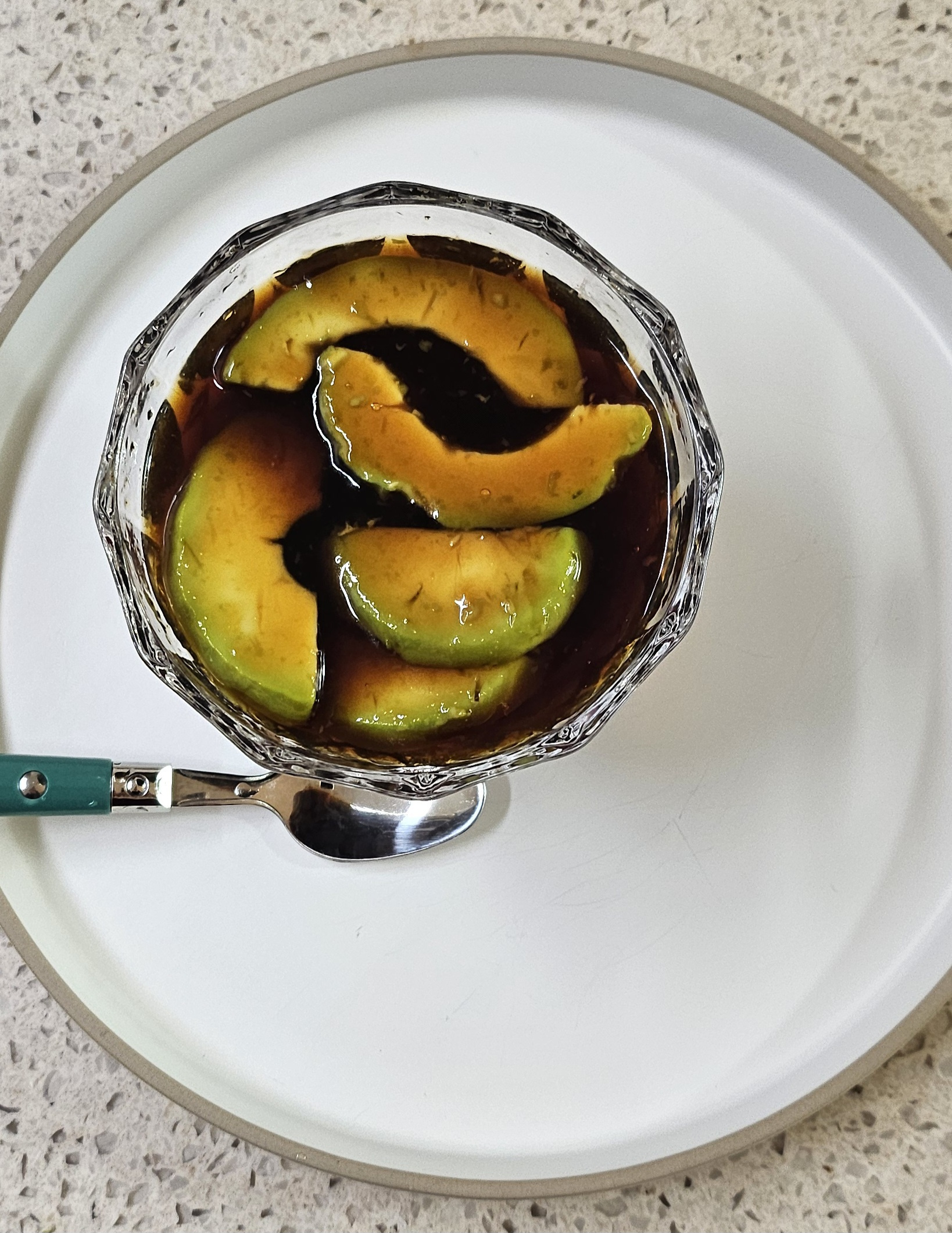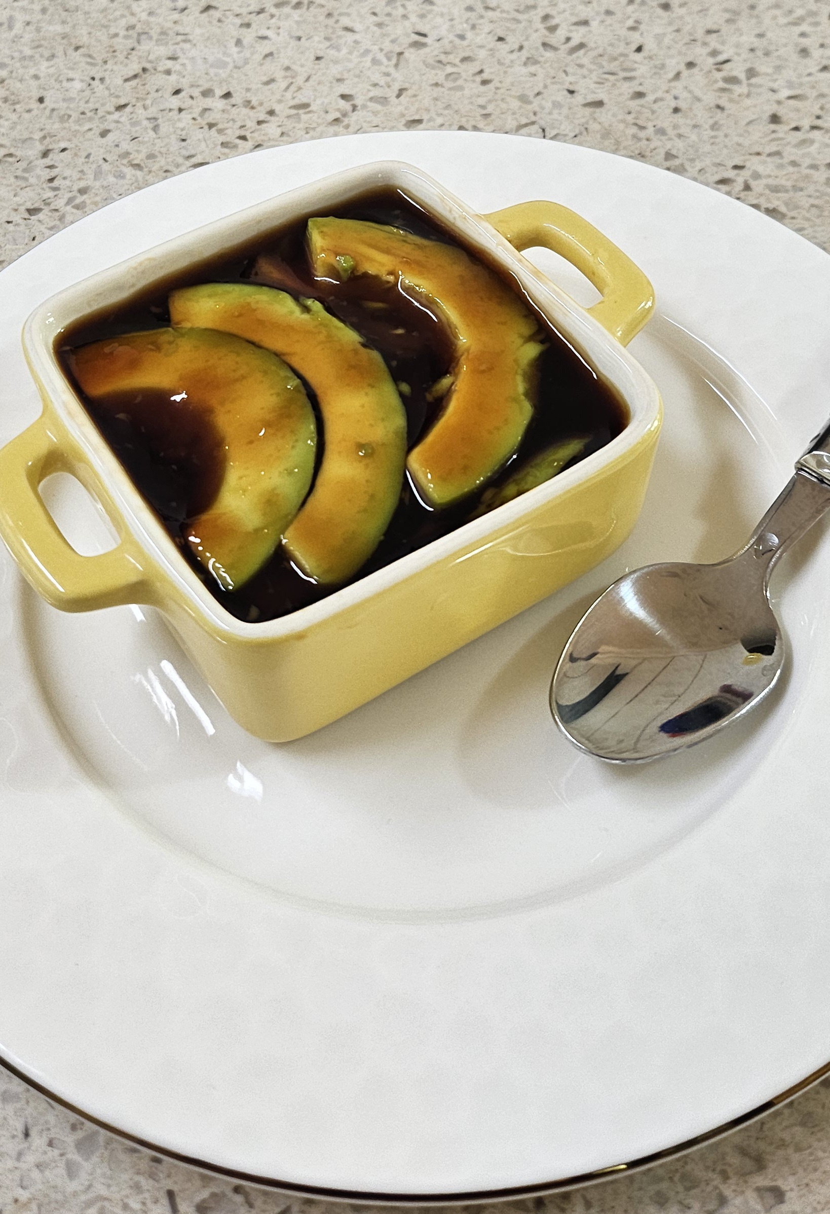 *이때 간장소스가 완전히 식지 않은 미지근할때 아보카도 위에 붓습니다.