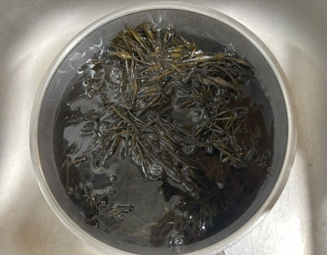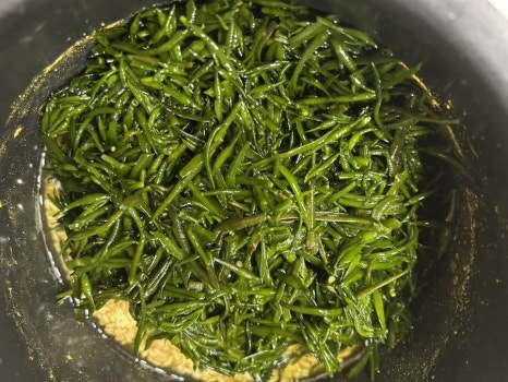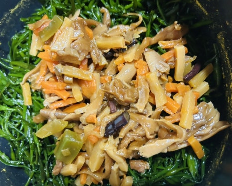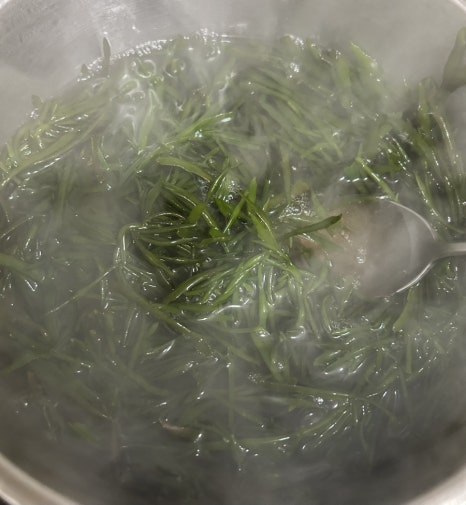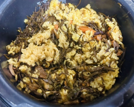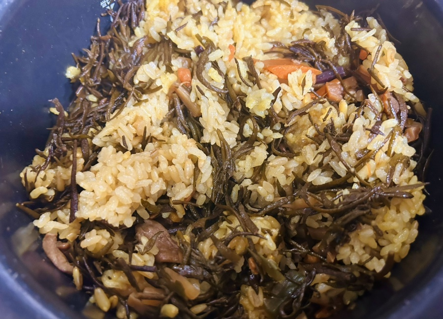 톳을 한번 데쳐서 밥에 넣고 같이 밥을 지어 톳솥밥이죠.