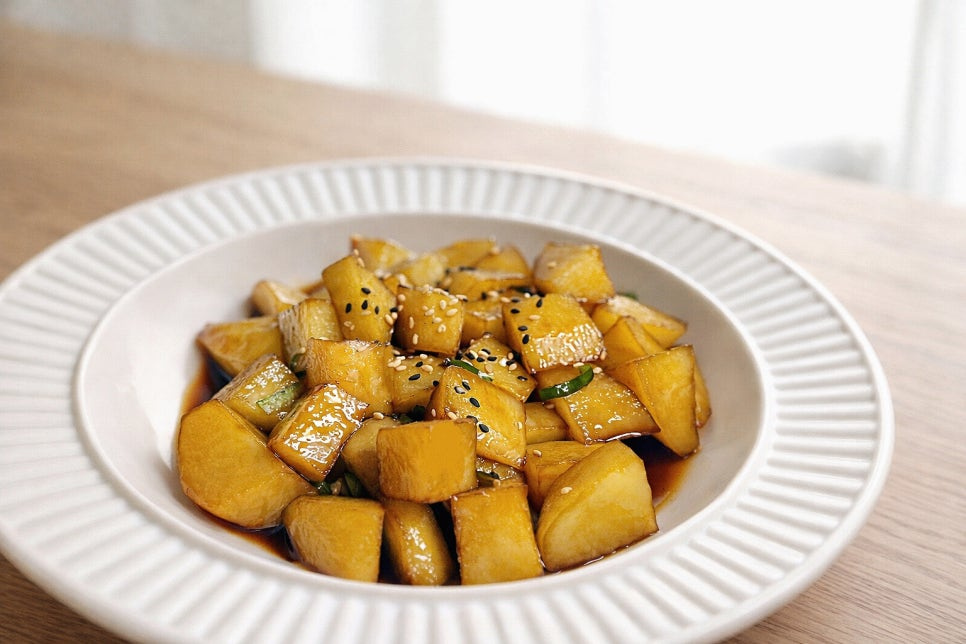 20분 정도 절여두면 감자에서 수분이 빠져나올 거예요. 물을 따로 붓지 않고 나온 물로 감자를 익힐 거라서 버리면 안 됩니다!!!!