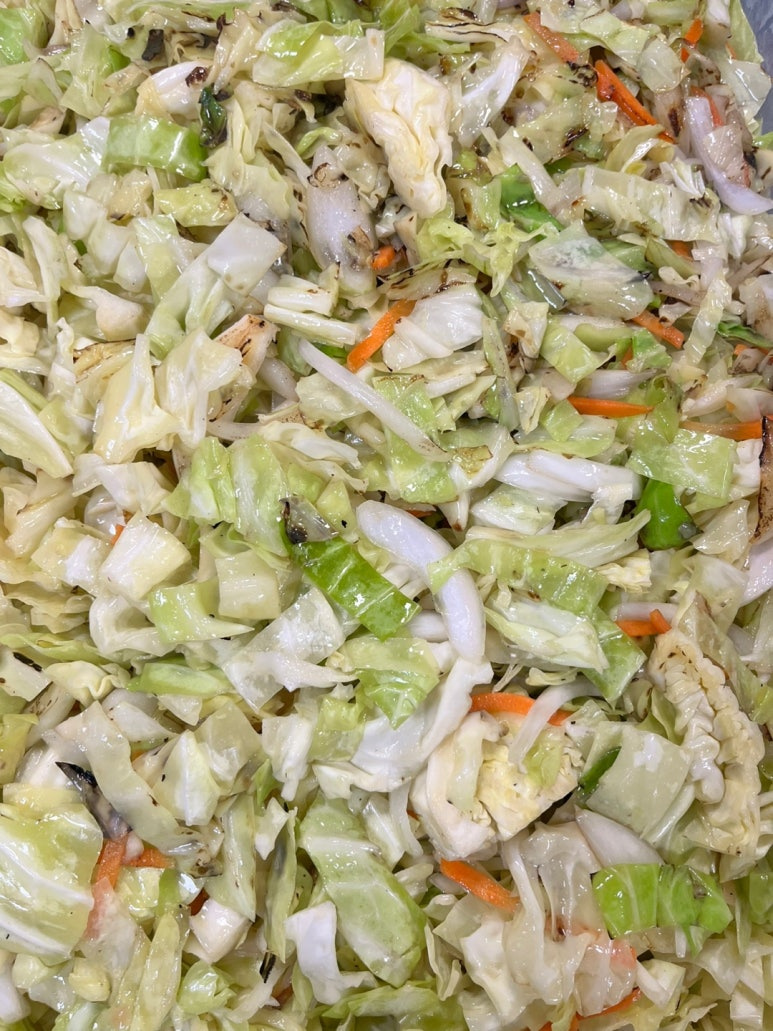 강불로 달군 팬에 야채를 먼저 넣고 소금 한 꼬집과 함께 빠르게 볶아 따로 덜어둡니다. (Tip: 야채를 따로 볶아야 나중에 물이 생기지 않고 아삭한 식감이 끝까지 살아있습니다.)
