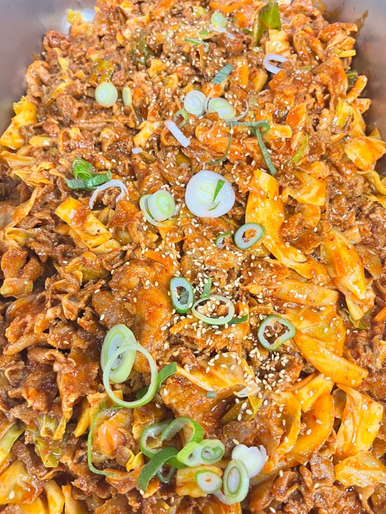 아까 볶아둔 야채를 고기와 합쳐 가볍게 섞어준 뒤, 대파와 깨를 뿌립니다. 접시에 담기 전 참기름 한 바퀴를 둘러 풍미를 더하면 끝!