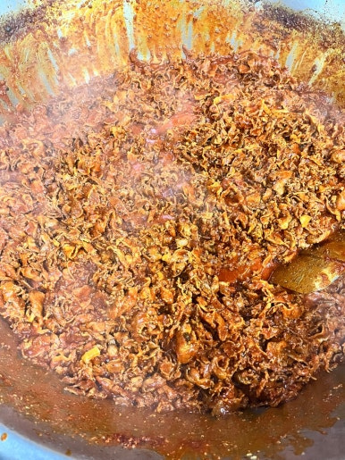 고기가 충분히 익으면 불을 약불로 줄이고 나머지 양념 재료를 넣어 볶아줍니다. (Tip: 양념을 넣은 뒤엔 타기 쉬우므로 불 조절에 주의하세요!)