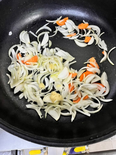 달궈진 팬에 식용유를 두르고 센 불에서 다진 마늘, 양파, 당근을 먼저 볶아 맛있는 기름 향을 냅니다.