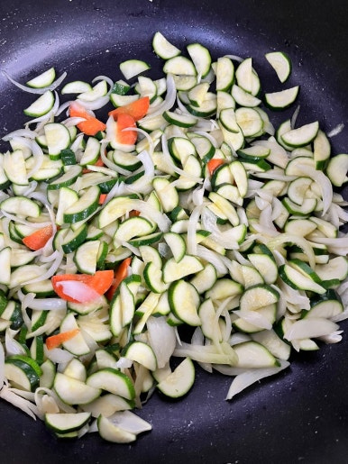 (핵심 비법!) 끓는 물 500ml에 소금 1t를 넣고 호박을 30초~1분 정도 짧게 데쳐냅니다. (Tip: 이렇게 하면 수분을 미리 잡아 볶을 때 물이 안 생기고, 호박 특유의 풋내와 쓴맛이 싹 사라집니다.)
