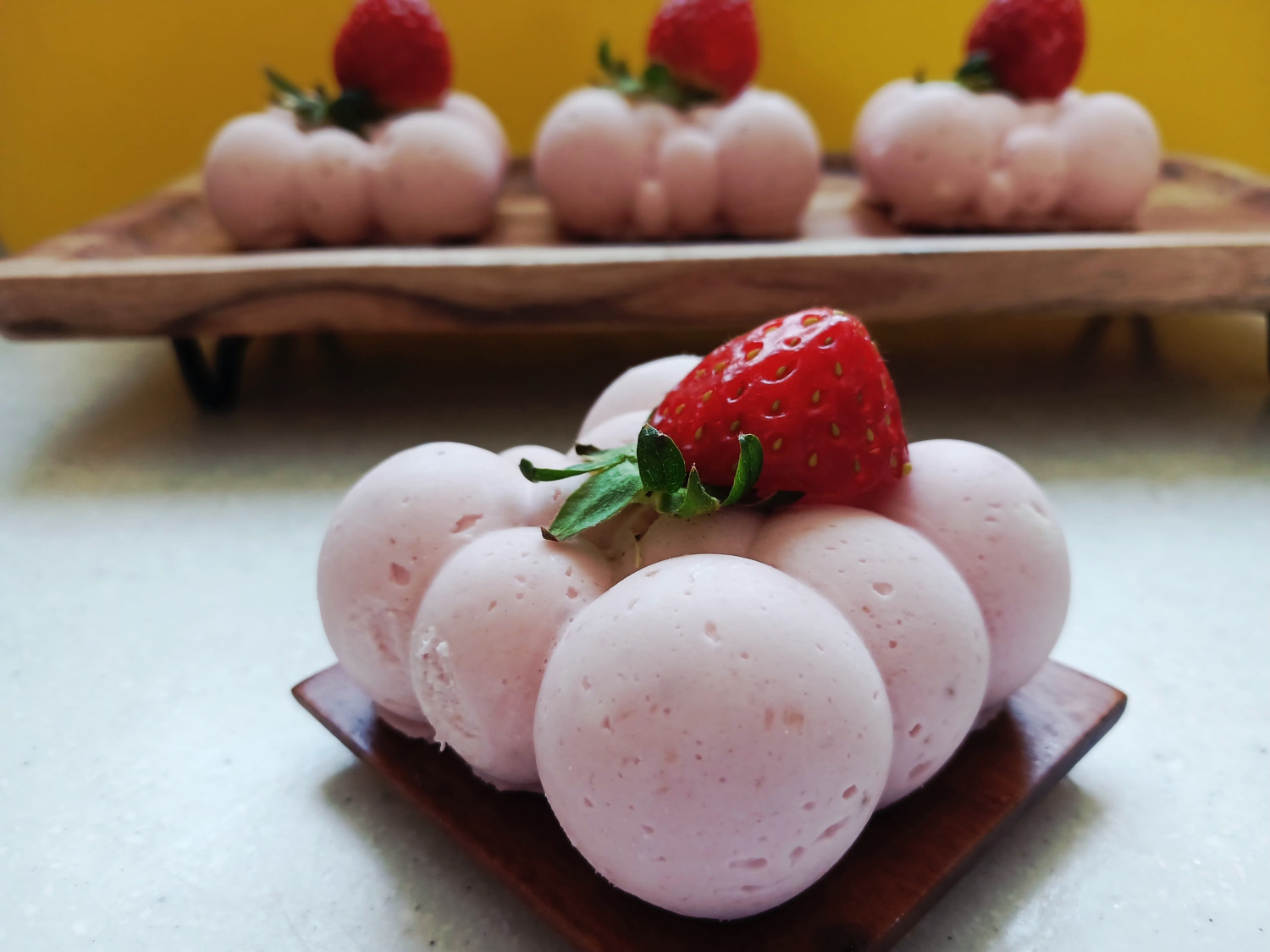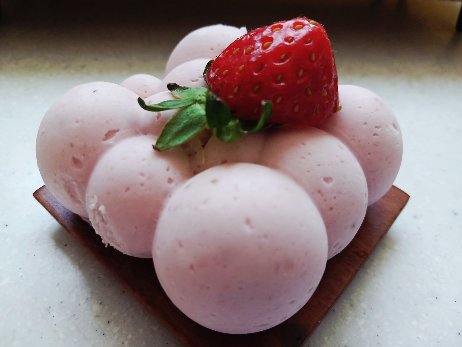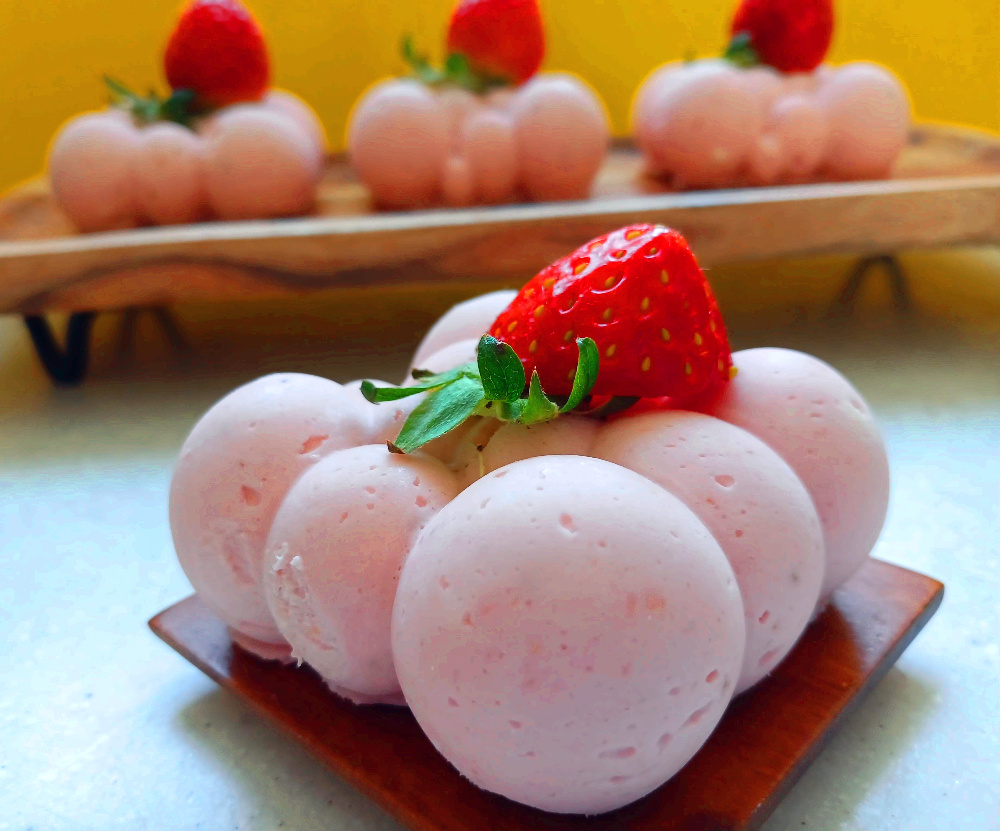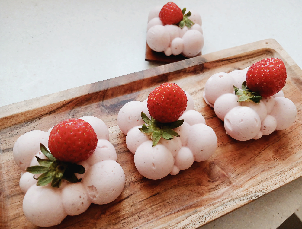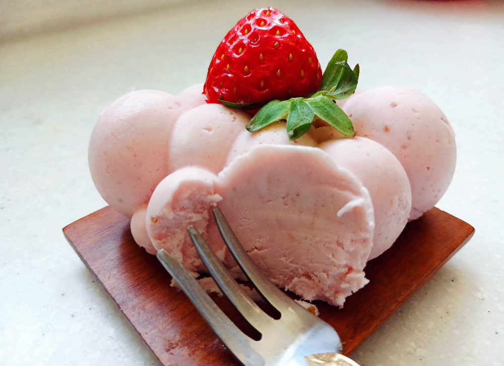 크림치즈에 생 딸기를 갈아 넣고 예쁜 몰드에 넣어서 굳힌 무스케익은