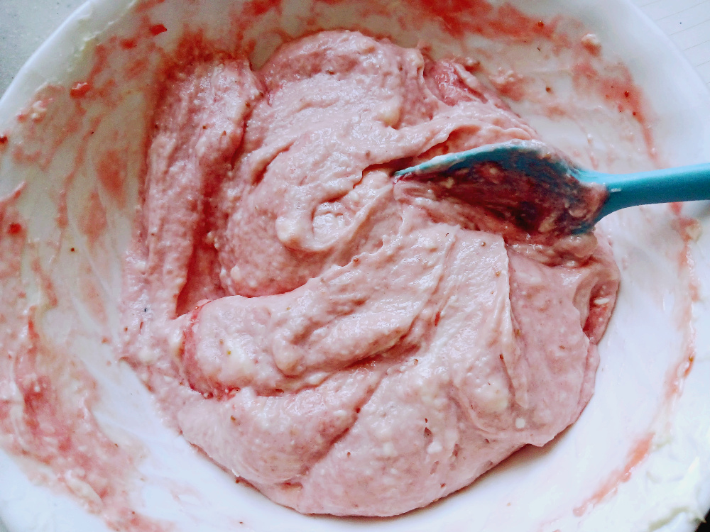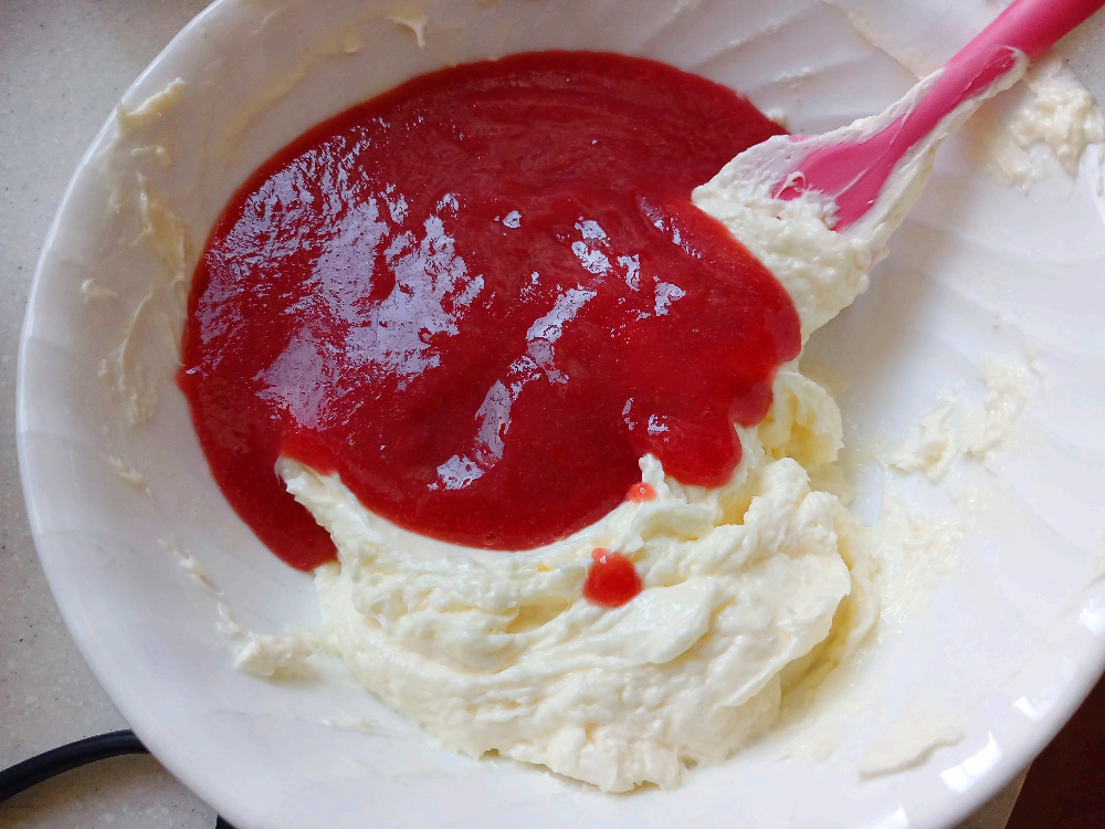 풀어준 크림치즈에 딸기퓌레와 휘핑크림을 넣고