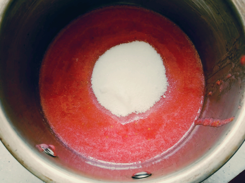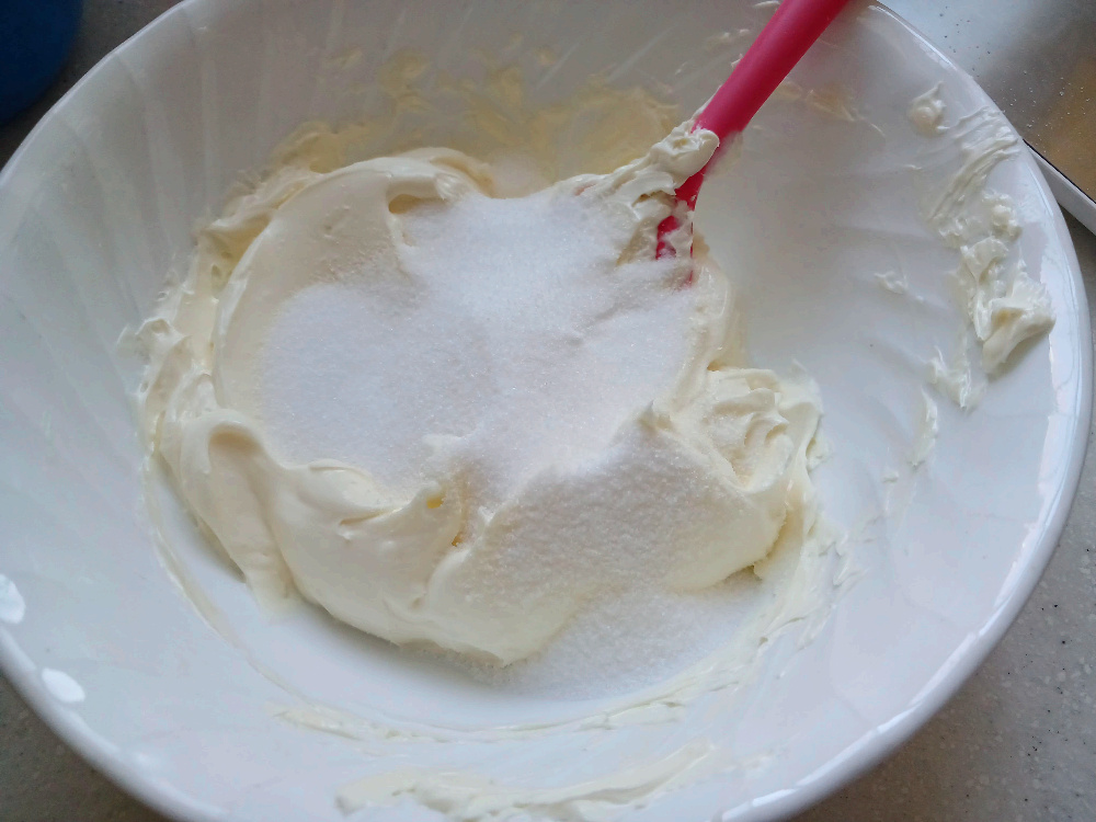 딸기 300 g , 설탕 50 g , 푸디 4 g , 크림치즈 300 g , 설탕 50 g , 생크림 100 g