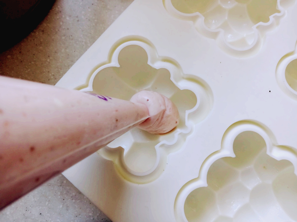 반죽을 짤주머니에 넣어 원하는 몰드에 꽉 차도록 채웁니다.