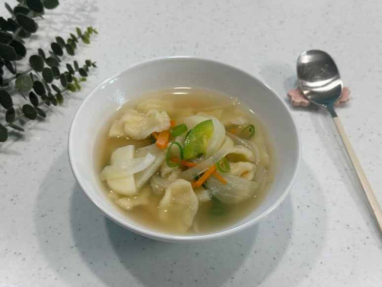 밀가루 400g , 물 250ml , 올리브유 1t , 감자 2개 , 양파 1/2개 , 대파 1/2개 , 애호박 1/2개 , 당근 1/3개 , 코인육수 2개 , 물 1L , 대게백간장 1t