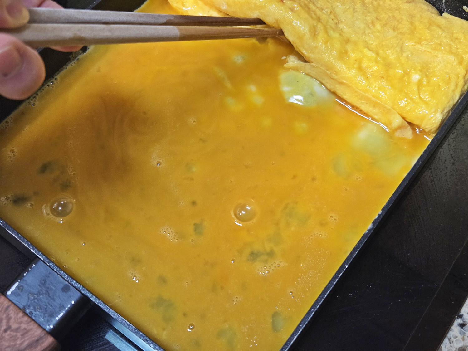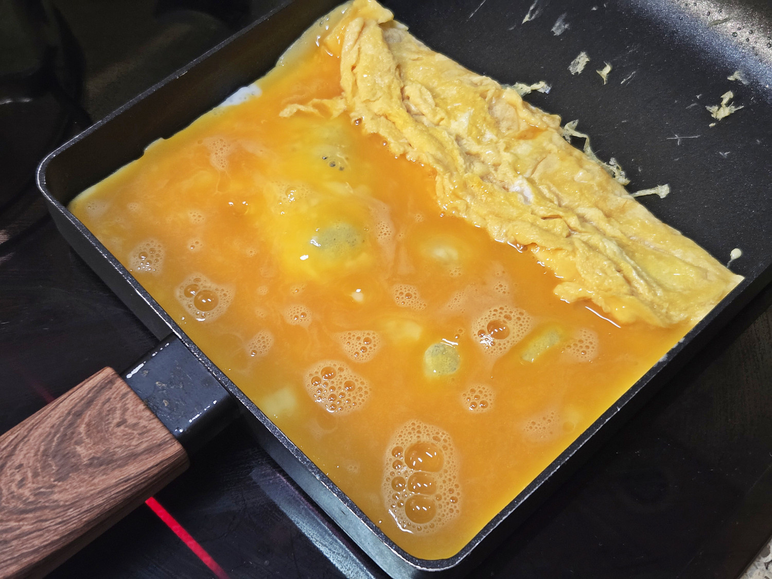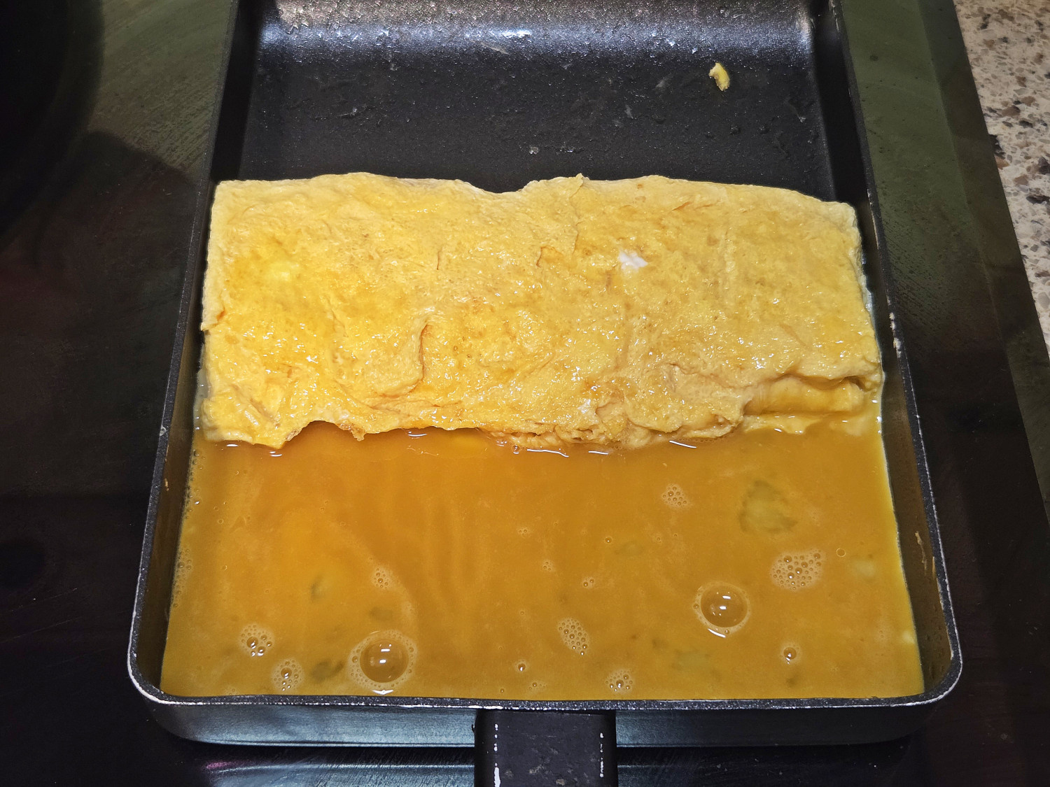 이어서 남은 달걀물을 모두 붓고, 달걀말이 아랫면에 달걀물이 들어갈 수 있도록 살짝 들어준 다음 다시 한번 달걀을 말아줍니다.