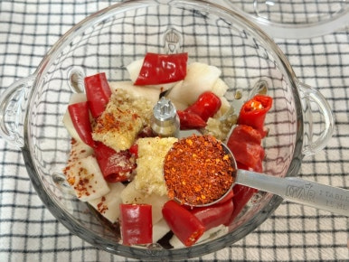 홍고추 3개, 고춧가루 200ml, 매실액 2T