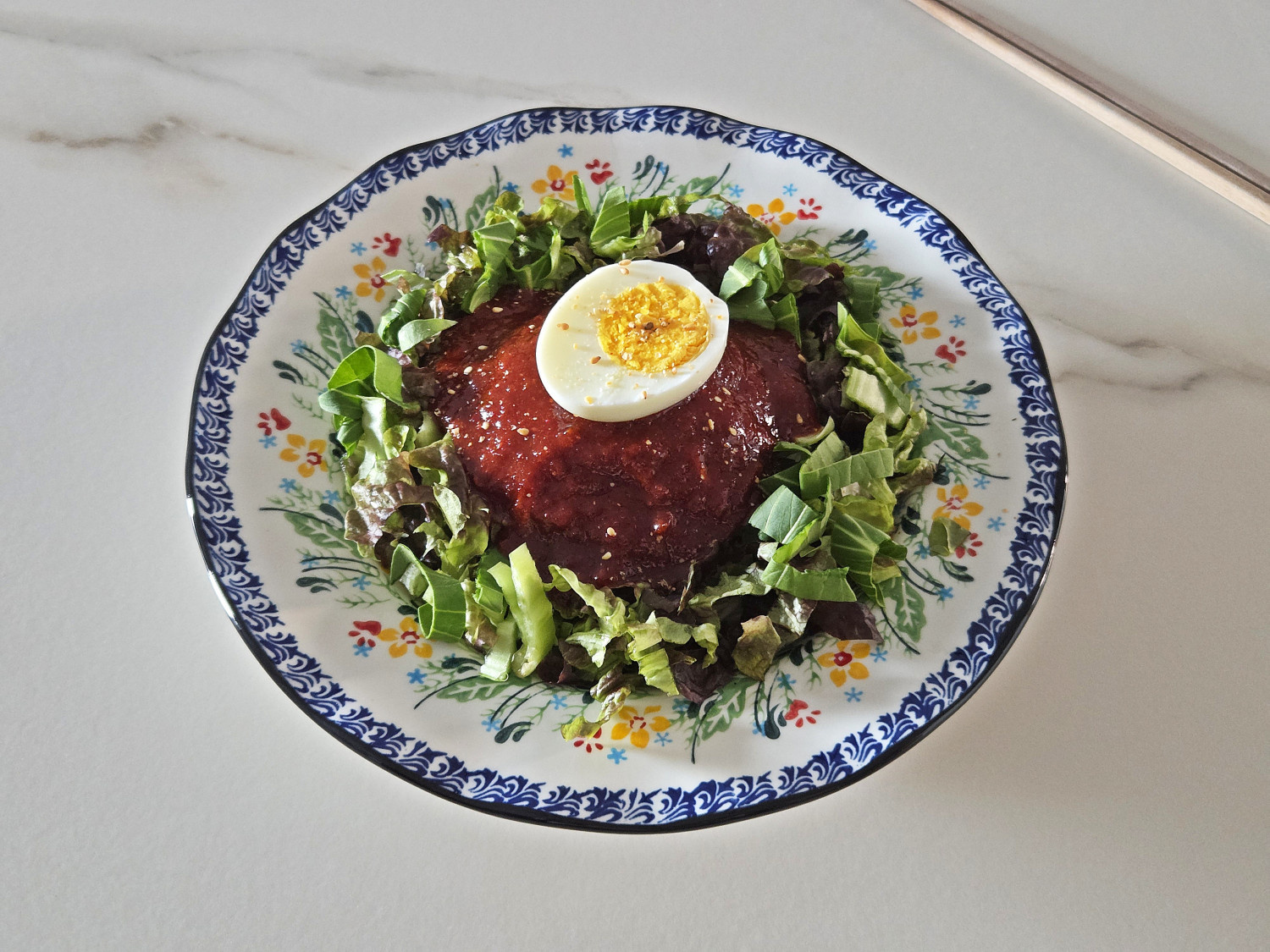 마지막으로 삶은 달걀과 간깨, 참기름을 살짝 뿌려 맛있게 즐기시면 됩니다.